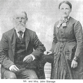 Text on the marker reads: James River, named for Jacques D’Englis, had two ferries, the lower established by John Stanage, a soldier, who had been at Ft. Pierre, in 1859, was on the Sioux City-Ft. Randall Military Road. Stanage was named Postmaster at James River P. O. on 13 March 1861. He stood off the Indians on 6 September 1862 and the chicken coop, still standing, has bullet holes to prove it. (Vandalized)